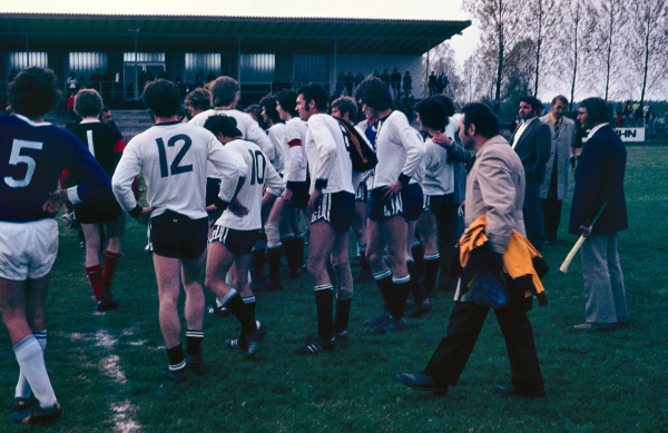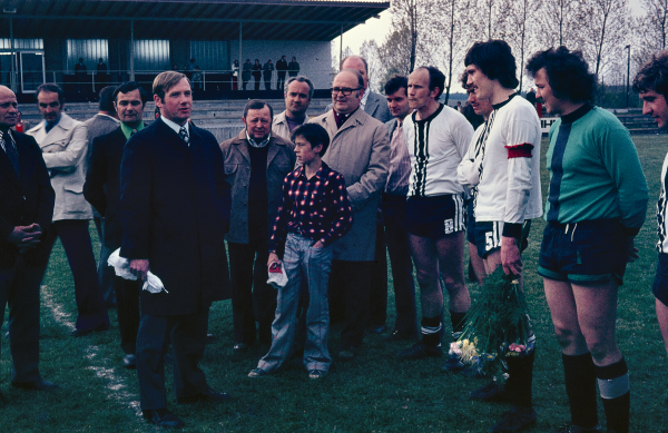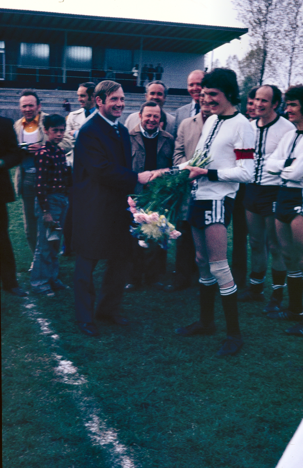 Bürgermeister Simon gratuliert zur Meisterschaft. Spieler: Leonhardt, Jakel, Dohmen, Hausmann, Schmittges, Seng, Zink, Thiel, Basler, Werner, Graf. Mäzen: Kappes).